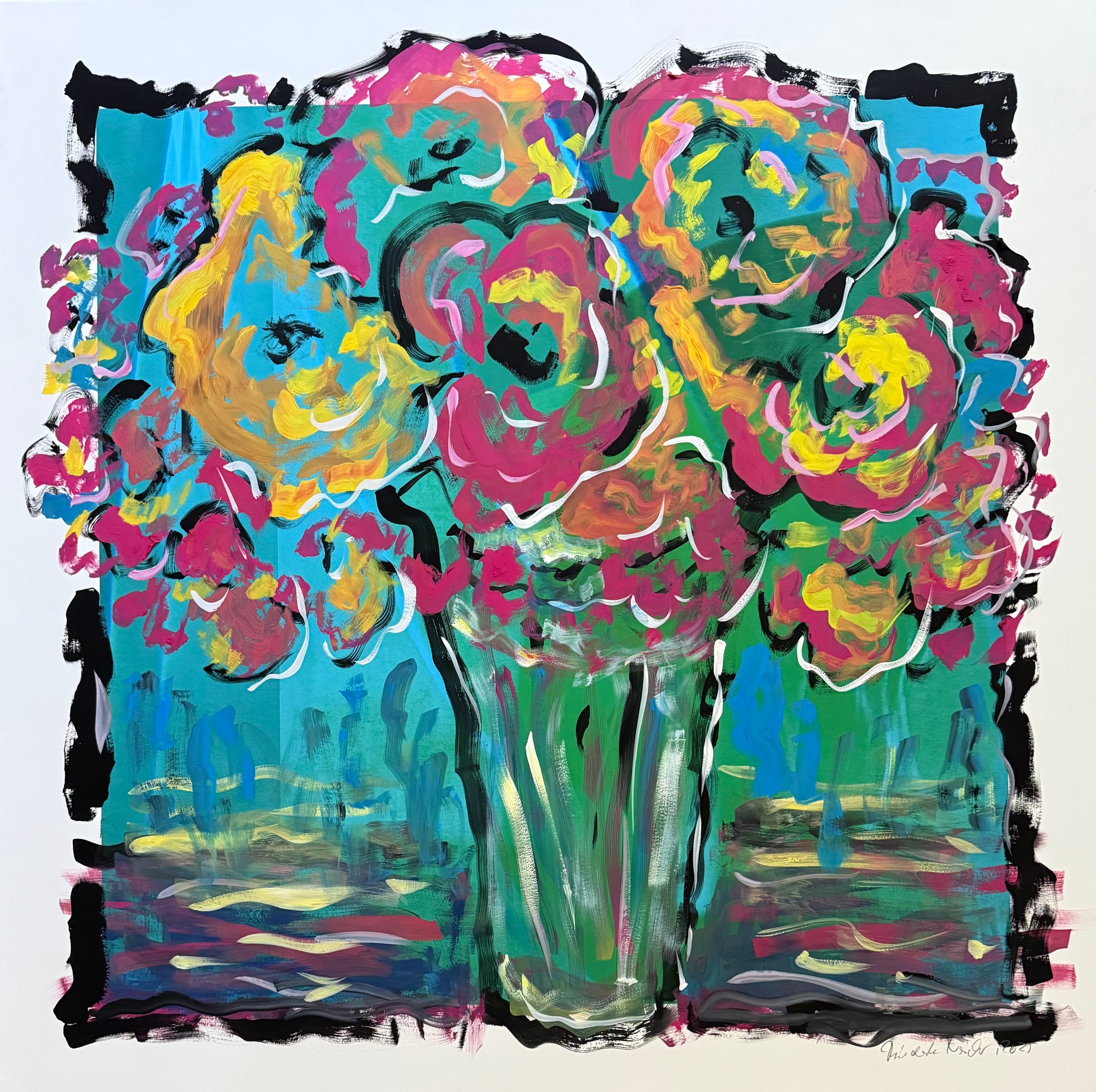 o. T. (Flowers on Emerald No. 54 Color Test Print Photogram) 2025 Painting, Gouache auf Hahnemühle (Unikat) Maß: 100 x 100 cm