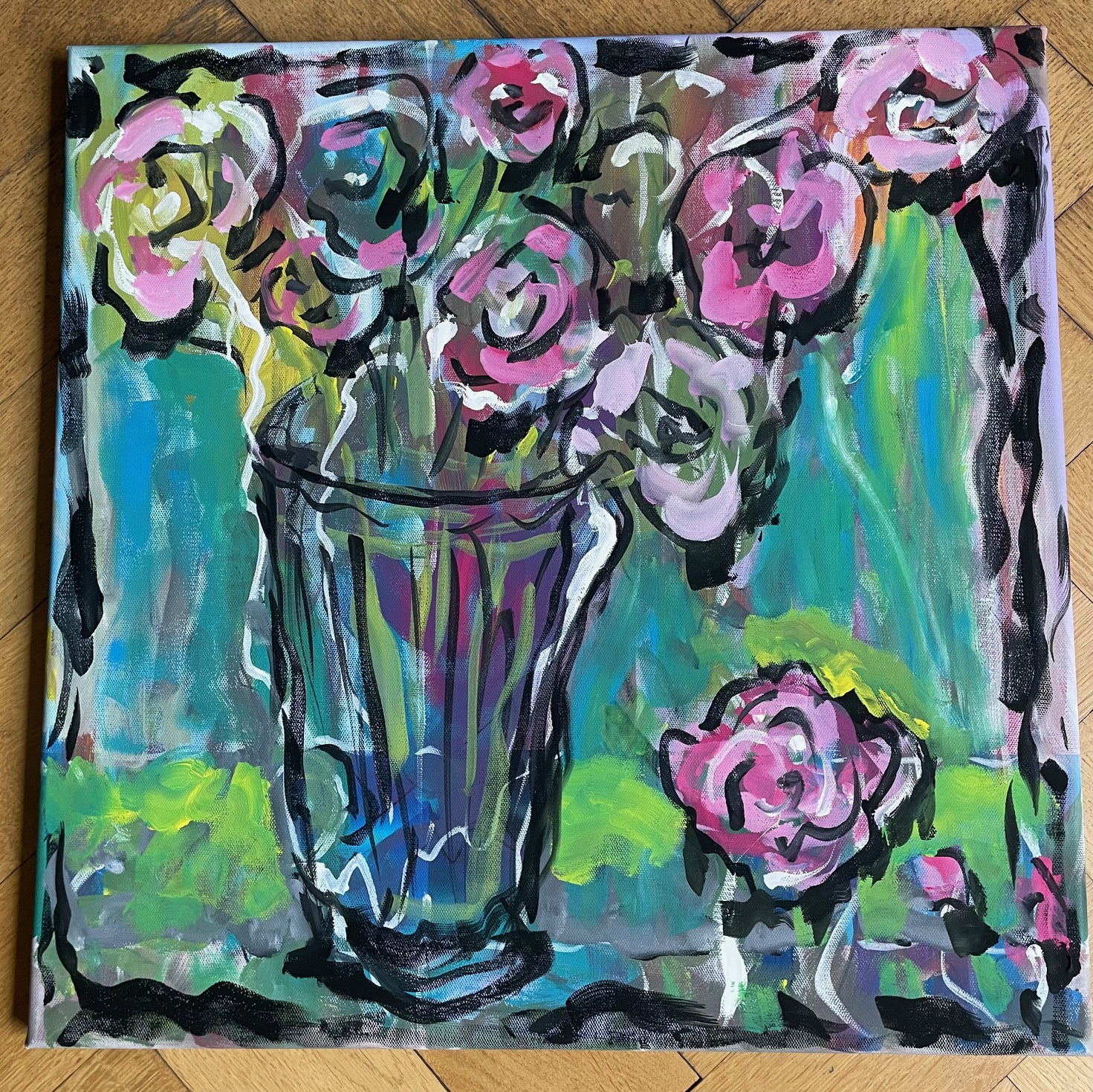 o. T. (Flowers and Blossoms on Color Test Print Photogram) 2025 Painting, Gouache auf Leinwand (Unikat) Maß: ca. 50 x 50 cm