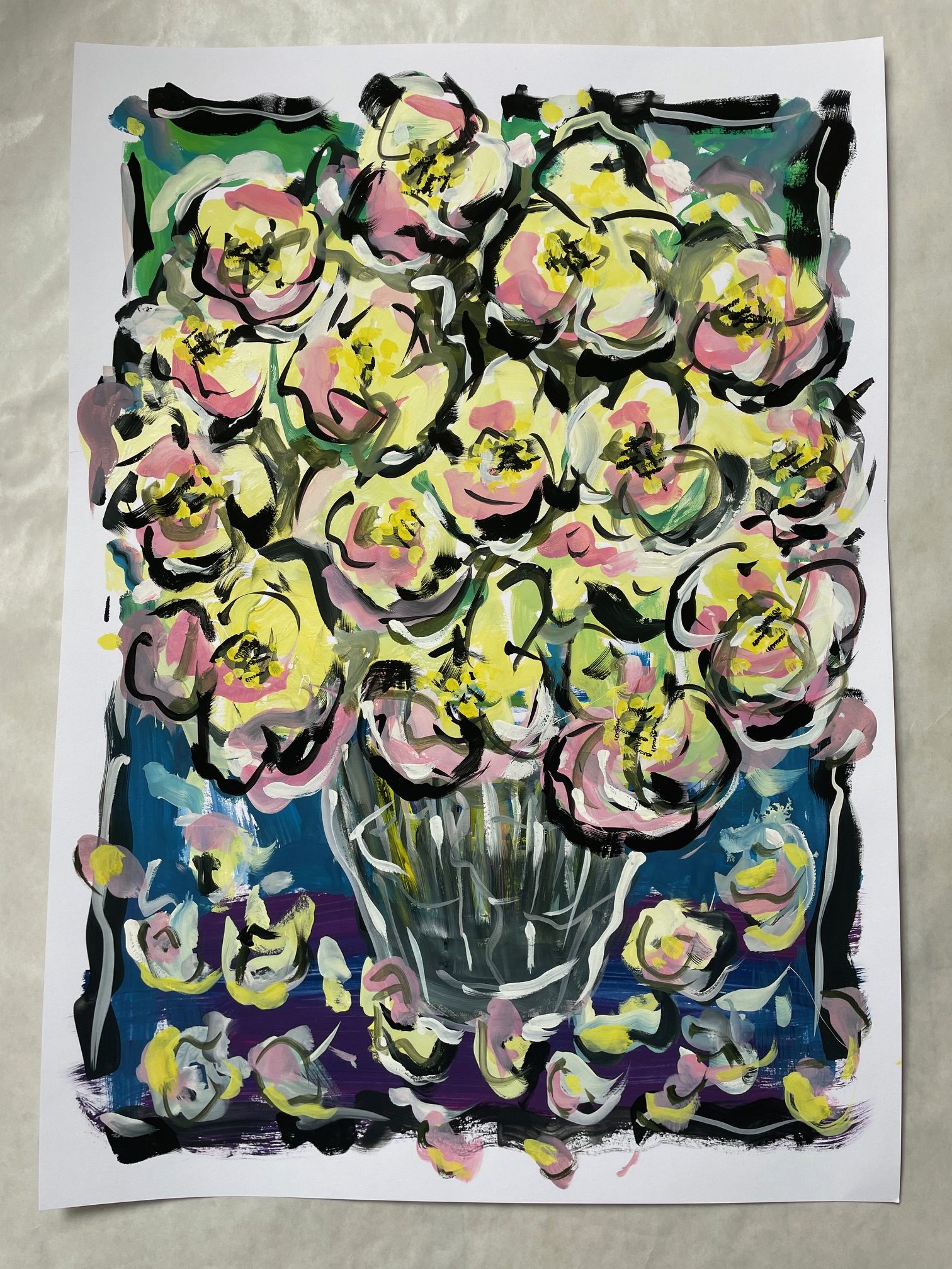 o. T. (Flowers on À Laszlo-3 Color Test Print Photogram) 2025 Painting, Gouache auf Hahnemühle (Unikat) Maß: ca. 70 x 100 cm